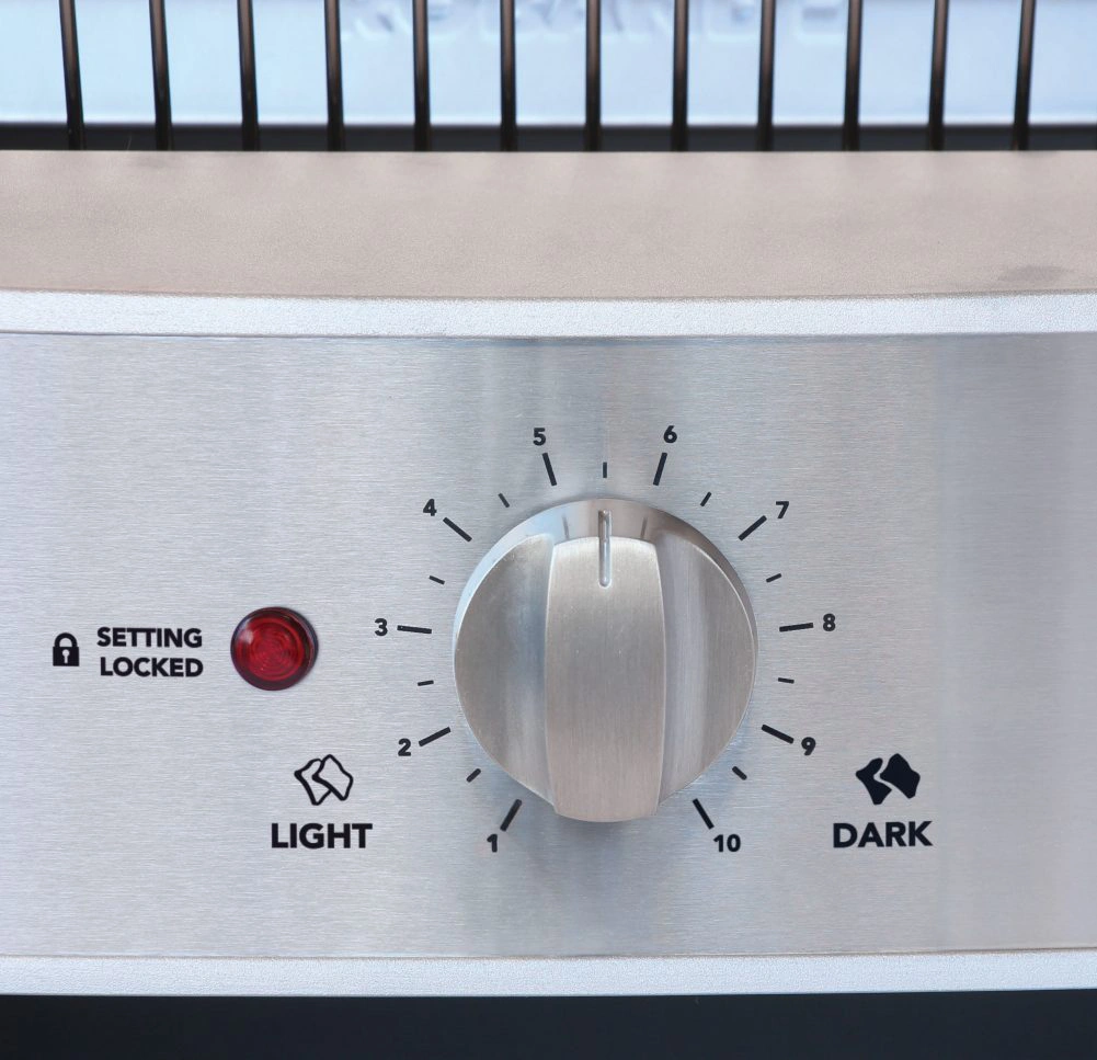 ● Adjustable speed control to modify the toasting time with electronic setting lock feature